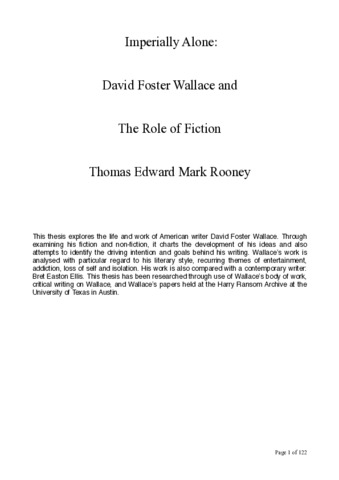 This thesis explores the life and work of American writer David Foster Wallace. Through examining his fiction and non-fiction, it charts the development of his ideas and also attempts to identify the driving intention and goals behind his writing. Wallace’s work is analysed with particular regard to his literary style, recurring themes of entertainment, addiction, loss of self and isolation. His work is also compared with a contemporary writer: Bret Easton Ellis. This thesis has been researched through use of Wallace’s body of work, critical writing on Wallace, and Wallace’s papers held at the Harry Ransom Archive at the University of Texas in Austin.