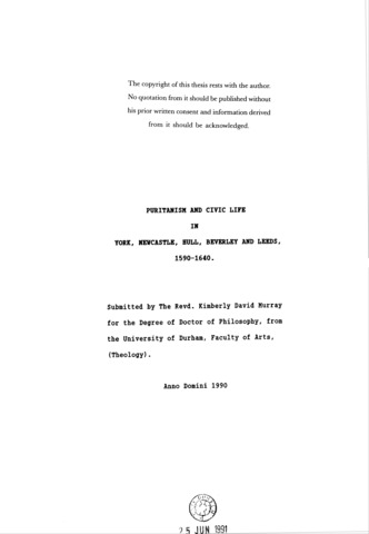 Puritanism and civic life in York, Newcastle, Hull, Beverley and Leeds, 1590-1640.