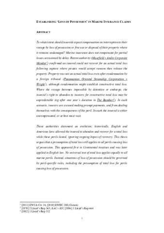 To what extent should insureds expect compensation on interruption to their voyage by loss of possession or free use or disposal of their property where it remains undamaged? Marine insurance does not compensate for partial losses occasioned by delay. Recent authority (Masefield v Amlin Corporate Member) confirmed an insured could not recover for an actual total loss following capture where pirates would accept ransom then release the property. Property was not an actual total loss even after condemnation by a foreign tribunal (Panamanian Oriental Steamship Corporation v Wright), although condemnation might establish constructive total loss. Where the voyage becomes impossible by detention or embargo, the insured’s right to abandon to insurers for constructive total loss may be unpredictable (eg after one year’s duration in The Bamburi). In each scenario, insurers are excused making prompt payments, and from dealing themselves with the consequences of the peril. In each the insured is either uncompensated, or at best must wait. These authorities document an evolution; historically, English and American laws allowed the insured to abandon and recover for a total loss while these perils lasted, ignoring ongoing hopes of recovery. This thesis argues that a presumption of total loss still applies to all perils causing loss of possession. This appeared first in Continental treatises and was later applied in English law. No universal test of total loss applies equally to all marine perils. Instead, situations of loss of possession should be governed by peril-specific rules, including the presumption of total loss for perils causing loss of possession.