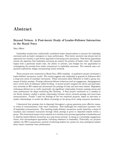 Leadership studies have traditionally considered leader characteristics to account for leadership outcomes such as leader emergence or team performance. This heroic narrative has always had its opponents but recently a post-heroic approach is becoming more prominent. Post-heroic approaches contest the assertion that leadership outcomes are mainly the product of leader traits. My research begins with a particular leader trait, the ability to interact, and bridges the two approaches by investigating the process from leader competence to leadership outcomes. The research uses a sequential exploratory design incorporating mixed methods. Three projects were conducted in Royal Navy (RN) warships. A qualitative project developed a leader-follower interaction model. The model suggests that leadership is granted by followers after a long-term series of mundane encounters. These encounters allow followers to build a group consensus of leader prestige. Prestige inuences follower behaviour such as engagement, disengagement and a covert form of resistance called levelling. A second project mapped the advice and participation networks on RN vessels and determined the prestige of team and sub-team leaders. Regression techniques allowed me to verify empirically the signicant relationship between prestige scores and team performance for ships conducting Sea Training. A nal project conducted on a warship in the South Atlantic verified a similar relationship between advice network prestige and intra-team communication. Finally I used the findings of the two empirical projects, based on sub-team or dyadic relationships, to model the effects of prestige at the group level, using computer simulation. I discovered that prestige that is dispersed throughout a group generates more effective teams, in terms of communication, than other conditions. This challenges the traditional top-down view of leadership communication. The resulting leader-follower interaction model describes a series of mundane and contested encounters through which prestige is given to dispersed leaders within a group. The theoretical impact of my research is to develop trait-process approaches to leadership and to describe leader-follower interaction as a post-heroic process. In doing so, I synthesise engagement theory with antropological approaches, including resistance to leadership. Practically, my projects validate the RN's compentency method of selecting leaders but points out that prestigious leaders alone cannot maximise team performance.