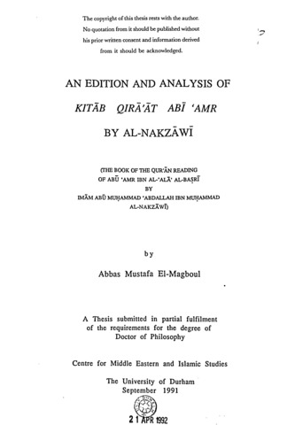 An edition and analysis of Kitab Qira'at Abi 'Amr by Al-Nakzawi.