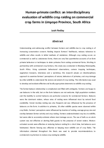 Understanding and addressing conflict between farmers and wildlife due to crop raiding is of increasing conservation concern. Raiding impacts farmers’ livelihoods, reduces tolerance to wildlife and often results in lethal methods of retaliation. Although crop raiding occurs on commercial as well as subsistence farms, there are very few quantitative accounts of on-farm primate behaviour or techniques to deter primates from raiding commercial farms. Working in partnership with commercial crop farmers, this study was conducted in Blouberg Municipality, South Africa. Using systematic behavioural observations, camera trapping techniques, vegetation transects, interviews and a workshop, this research adopts an interdisciplinary approach to examine farmers’ perceptions of nature, behaviour of primates, and crop damage by other wildlife to understand the nature and extent of crop raiding. This information was used to develop and evaluate effective and locally appropriate deterrents to wildlife crop raiding. The farmer-baboon relationship is complicated and filled with ambiguity. Farmers are happy to see baboons in the wild, but on the farm baboons are not welcome. High population numbers and the inability to control baboons are particular concerns for commercial farmers. Baboons were the dominant raiders, whose rates of raiding were influenced most by natural food availability. Vervet monkey raiding was also frequent and was influenced by the presence of baboons on the farm. In addition to primates, 18 other wildlife species were observed within crop fields. Farmers’ perceptions were influenced by duration of raiding, average group size and overlap between farmer activity and crop raiding. Farmers underestimated crop loss to wildlife, but were able to accurately estimate where most damage occurs. The use of bells as an alarm system was not effective at alerting field guards to the presence of vervet raiders. Motion-activated sounds were effective at reducing baboon raiding for a short time, but baboons soon habituated. Electric fencing was effective at keeping most wildlife out of crop fields. The information obtained throughout the thesis was used to provide recommendations to commercial crop farmers to reduce crop raiding by wildlife.