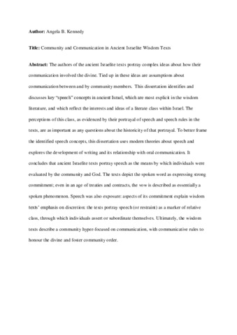 The authors of the ancient Israelite texts portray complex ideas about how their communication involved the divine. Tied up in these ideas are assumptions about communication between and by community members. This dissertation identifies and discusses key “speech” concepts in ancient Israel, which are most explicit in the wisdom literature, and which reflect the interests and ideas of a literate class within Israel. The perceptions of this class, as evidenced by their portrayal of speech and speech rules in the texts, are as important as any questions about the historicity of that portrayal. To better frame the identified speech concepts, this dissertation uses modern theories about speech and explores the development of writing and its relationship with oral communication. It concludes that ancient Israelite texts portray speech as the means by which individuals were evaluated by the community and God. The texts depict the spoken word as expressing strong commitment; even in an age of treaties and contracts, the vow is described as essentially a spoken phenomenon. Speech was also exposure: aspects of its commitment explain wisdom texts’ emphasis on discretion: the texts portray speech (or restraint) as a marker of relative class, through which individuals assert or subordinate themselves. Ultimately, the wisdom texts describe a community hyper-focused on communication, with communicative rules to honour the divine and foster community order.