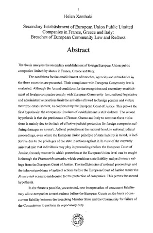 Secondary establishment of European Union public limited companies in France, Greece and Italy : breaches of European Community law and redress.