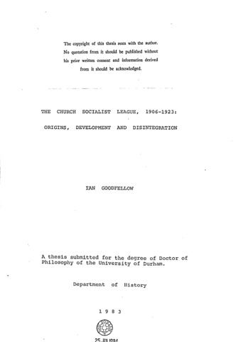 The Church Socialist League 1906-1923 : Origins, development and disintegration.