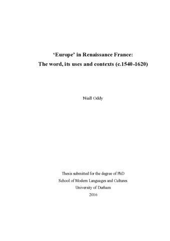 This thesis offers a study of the word ‘Europe’ in French Renaissance writing (c.1540- 1620). It uses the technique of close reading to analyse how the word was used in a variety of contexts and how it related to issues of significant cultural, social and political import, including the Reformation and the Wars of Religion, the expansion of the Ottoman Empire, and the discovery of the ‘New World’. In considering these contexts, the thesis moves beyond an analysis of the term Europe in order to examine instances where the word does not appear and to assess the significance of non-usage. The thesis contributes to the history of the idea of Europe in the sixteenth and early-seventeenth centuries by illuminating how Europe was a flexible term that could be adopted by different writers for different purposes. In turn, the focus on Europe gives rise to new interpretations of French Renaissance texts. Chapter One compares the use of geographical discourse in Rabelais’s 'Quart Livre' and Apian’s 'Cosmographie'. Chapter Two examines the representation of communities and their boundaries in Montaigne’s 'Journal de voyage' and the cosmographies of Thevet and Belleforest. Chapter Three considers the impact of the Reformation on thinking about Europe by analysing Léry’s 'Histoire d’un voyage' and d’Aubigné’s 'Histoire universelle'. Chapter Four investigates the impact of the Ottoman Empire on ideas of Europe through an examination of the poetry of Ronsard and the political tracts of François Savary de Brèves, French ambassador to Constantinople. Chapter Five explores Europe in relation to the New World, contrasting the differing uses of the word Europe in Thevet’s 'Les Singularitez de la France antarctique' and Montaigne’s 'Essais'.