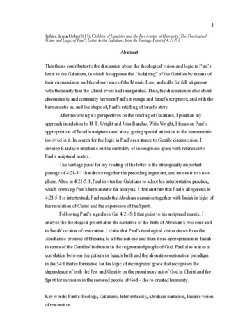 | Uncontrolled Keywords | Paul's theology, Galatians, Intertextuality, Abraham narrative, Isaiah's vision of restoration |