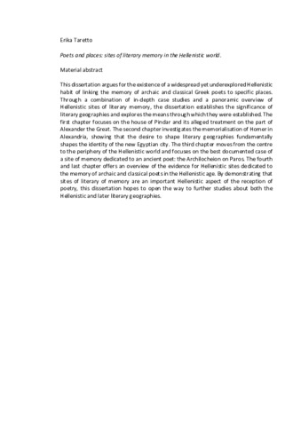 This dissertation argues for the existence of a widespread yet underexplored Hellenistic habit of linking the memory of archaic and classical Greek poets to specific places. Through a combination of in-depth case studies and a panoramic overview of Hellenistic sites of literary memory, the dissertation establishes the significance of literary geographies and explores the means through which they were established. The first chapter focuses on the house of Pindar and its alleged treatment on the part of Alexander the Great. The second chapter investigates the memorialisation of Homer in Alexandria, showing that the desire to shape literary geographies fundamentally shapes the identity of the new Egyptian city. The third chapter moves from the centre to the periphery of the Hellenistic world and focuses on the best documented case of a site of memory dedicated to an ancient poet: the Archilocheion on Paros. The fourth and last chapter offers an overview of the evidence for Hellenistic sites dedicated to the memory of archaic and classical poets in the Hellenistic age. By demonstrating that sites of literary of memory are an important Hellenistic aspect of the reception of poetry, this dissertation hopes to open the way to further studies about both the Hellenistic and later literary geographies.