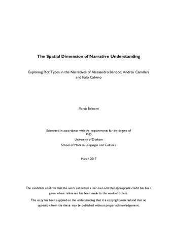 The thesis explores the hypothesis that some plots might rely on spatiality as an organising principle that impacts on the narrative structure and, consequently, on the strategies adopted by readers to understand them. In order to lay the grounding for a spatially-oriented approach to narrative understanding, this study pursues both a theoretical line of inquiry and an applied line of inquiry in literary criticism. A cognitive stance on the nature of thought as non-propositional (Johnson-Laird 1983) and of the mind as embodied (Lakoff and Johnson 1999; Varela et al. 1993) provides the theoretical point of departure for the subsequent identification of a range of principles and frameworks that can be implemented to support a spatially-oriented interpretation according to the specificities of narratives. The three case studies provided by Alessandro Baricco’s City, Andrea Camilleri’s Montalbano crime series, and Italo Calvino’s Se una notte d’inverno un viaggiatore illustrate how a spatially-oriented perspective can add new interpretive angles and an unprecedented insight into the ways narratives achieve a coherent structure. At the same time, the case studies serve to extrapolate a set of features that constitute the preliminary criteria for assessing whether it would be fruitful to apply a spatially-oriented approach to a specific narrative. Baricco’s, Camilleri’s and Calvino’s works represent three plot types in which spatiality impinges in three different ways on the narrative, which, as I will show, can be epitomised by the image schemata of map, trajectory, and fractal. Far from simply referring to objects which plot is compared to, these images indicate procedural techniques and strategies of sense-making that a certain type of narrative is designed to prompt in the reader through textual cues. The study, in fact, builds on and advances a notion of plot to be analysed as a process rather than a given structure, something that readers understand as they read, and not retrospectively only.