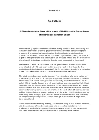Tuberculosis (TB) is an infectious disease mainly transmitted to humans by the inhalation of infected droplets (produced when an infected person coughs or sneezes). It is caused by bacteria within the Mycobacterium tuberculosis complex, several species of which can cause infection in humans. In the early 1990s, the World Health Organisation (WHO) declared TB a global emergency and this continues to be the case today. We seem to be further from eradicating this killer disease than we have been at any point in our past, and the increase in global travel, including migration, is thought to be exacerbating its spread. Building on previous projects that extracted and analysed ancient DNA of M. tuberculosis complex organisms from skeletons with bone changes consistent with TB from the Roman period in Britain, this research tests the hypothesis that people buried in Roman Britain who were infected with TB had been mobile at some point in their lives, by the application of stable isotopic analysis (C, N, Sr, O) to the same skeletons to establish if their childhoods were local or non-local to their burial locations. This study uses bone and dental samples from skeletons from the ancient DNA projects who were buried on chalk geology and with bone changes suggesting possible TB and/or a positive TB ancient DNA result. The sites investigated were Driffield Terrace in York, Baldock, Easington, Winchester, Cirencester and Poundbury. Collagen was successfully extracted from bone for 19 out of 21 individuals. Carbon and nitrogen isotope analysis revealed that all but three of these people ate a diet based on C3 terrestrial ecosystems with limited aquatic food intake, and they were similar to other people buried in the same or other contemporary cemeteries. Enamel from the teeth of all 21 individuals was also subject to strontium and oxygen isotope analysis, which identified six people as not having been brought up in the local area where they were buried. The remaining 15 people were possibly raised locally, although other places of origin have been considered. It was concluded that linking mobility, as identified using stable isotope analysis, with transmission of infectious disease evidence in the skeleton is very challenging, particularly because there is no way of knowing how long people had been infected with the disease before or after they were mobile. Finally, some suggestions of how to take this important work forward were made. This includes repeating the work on an available larger sample size of possible TB sufferers without constraints of only testing those individuals buried on chalk geology.