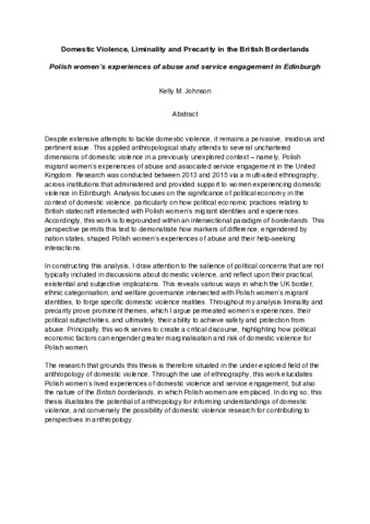Despite extensive attempts to tackle domestic violence, it remains a pervasive, insidious and pertinent issue. This applied anthropological study attends to several unchartered dimensions of domestic violence in a previously unexplored context – namely, Polish migrant women’s experiences of abuse and associated service engagement in the United Kingdom. Research was conducted between 2013 and 2015 via a multi-sited ethnography, across institutions that administered and provided support to women experiencing domestic violence in Edinburgh. Analysis focuses on the significance of political economy in the context of domestic violence, particularly on how political economic practices relating to British statecraft intersected with Polish women’s migrant identities and experiences. Accordingly, this work is foregrounded within an intersectional paradigm of borderlands. This perspective permits this text to demonstrate how markers of difference, engendered by nation states, shaped Polish women’s experiences of abuse and their help-seeking interactions. In constructing this analysis, I draw attention to the salience of political concerns that are not typically included in discussions about domestic violence, and reflect upon their practical, existential and subjective implications. This reveals various ways in which the UK border, ethnic categorisation, and welfare governance intersected with Polish women’s migrant identities, to forge specific domestic violence realities. Throughout my analysis liminality and precarity prove prominent themes, which I argue permeated women’s experiences, their political subjectivities, and ultimately, their ability to achieve safety and protection from abuse. Principally, this work serves to create a critical discourse, highlighting how political economic factors can engender greater marginalisation and risk of domestic violence for Polish women. The research that grounds this thesis is therefore situated in the under-explored field of the anthropology of domestic violence. Through the use of ethnography, this work elucidates Polish women’s lived experiences of domestic violence and service engagement, but also the nature of the British borderlands, in which Polish women are emplaced. In doing so, this thesis illustrates the potential of anthropology for informing understandings of domestic violence, and conversely the possibility of domestic violence research for contributing to perspectives in anthropology.