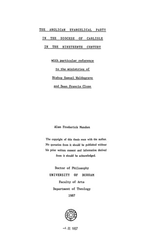 The Anglican Evangelical party in the diocese of Carlisle in the nineteenth century with particular reference to the ministeries of Bishop Samuel Waldegrave and Dean Francis Close.