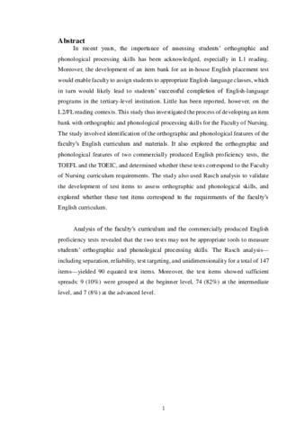 In recent years, the importance of assessing students’ orthographic and phonological processing skills has been acknowledged, especially in L1 reading. Moreover, the development of an item bank for an in-house English placement test would enable faculty to assign students to appropriate English-language classes, which in turn would likely lead to students’ successful completion of English-language programs in the tertiary-level institution. Little has been reported, however, on the L2/FL reading contexts. This study thus investigated the process of developing an item bank with orthographic and phonological processing skills for the Faculty of Nursing. The study involved identification of the orthographic and phonological features of the faculty’s English curriculum and materials. It also explored the orthographic and phonological features of two commercially produced English proficiency tests, the TOEFL and the TOEIC, and determined whether these tests correspond to the Faculty of Nursing curriculum requirements. The study also used Rasch analysis to validate the development of test items to assess orthographic and phonological skills, and explored whether these test items correspond to the requirements of the faculty’s English curriculum. Analysis of the faculty’s curriculum and the commercially produced English proficiency tests revealed that the two tests may not be appropriate tools to measure students’ orthographic and phonological processing skills. The Rasch analysis— including separation, reliability, test targeting, and unidimensionality for a total of 147 items—yielded 90 equated test items. Moreover, the test items showed sufficient spreads: 9 (10%) were grouped at the beginner level, 74 (82%) at the intermediate level, and 7 (8%) at the advanced level.