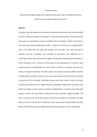 The thesis uses the Harleys as a case study to determine what their own personal beliefs can tell us about the nature of puritanism in the early Stuart period. Two key personal documents are examined in order to establish that the Harleys’ ‘brand’ of puritanism was built upon several fundamental pillars: a belief in the doctrine of predestination, that is the belief that the world was divided into the ‘elect’ who were assured of salvation and the ‘reprobate’ who doomed to damnation; the preference for a preaching ministry; the observance of regular private days of fasting and humiliation; a fierce iconoclasm and a mistrust of the power of the episcopacy; all of which were underscored by the belief that the word of God, as found in Scripture, was the only arbiter of religious orthodoxy. The thesis goes on to explore how these beliefs compare to those held by puritan ministers whom were known personally to the Harleys, through a discussion of the ministers’ published sermons and other works. Finally, the thesis examines the public life of Sir Robert Harley as a Member of Parliament and the private life of the Harleys in their corner of northern Herefordshire, in order to show that both aspects of their life were heavily influenced by their particular religious beliefs. The thesis concludes that, while early Stuart puritanism was fluid and individual, and that there can be no ‘one size fits all’ definition, there were certain shared beliefs, the finer details of which were open to debate and discussion among the puritans themselves.