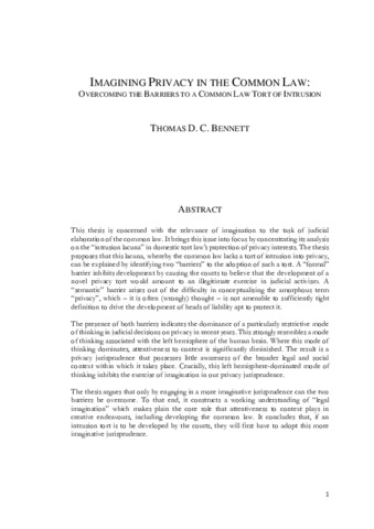This thesis is concerned with the relevance of imagination to the task of judicial elaboration of the common law. It brings this issue into focus by concentrating its analysis on the “intrusion lacuna” in domestic tort law’s protection of privacy interests. The thesis proposes that this lacuna, whereby the common law lacks a tort of intrusion into privacy, can be explained by identifying two “barriers” to the adoption of such a tort. A “formal” barrier inhibits development by causing the courts to believe that the development of a novel privacy tort would amount to an illegitimate exercise in judicial activism. A “semantic” barrier arises out of the difficulty in conceptualising the amorphous term “privacy”, which – it is often (wrongly) thought – is not amenable to sufficiently tight definition to drive the development of heads of liability apt to protect it. The presence of both barriers indicates the dominance of a particularly restrictive mode of thinking in judicial decisions on privacy in recent years. This strongly resembles a mode of thinking associated with the left hemisphere of the human brain. Where this mode of thinking dominates, attentiveness to context is significantly diminished. The result is a privacy jurisprudence that possesses little awareness of the broader legal and social context within which it takes place. Crucially, this left hemisphere-dominated mode of thinking inhibits the exercise of imagination in our privacy jurisprudence. The thesis argues that only by engaging in a more imaginative jurisprudence can the two barriers be overcome. To that end, it constructs a working understanding of “legal imagination” which makes plain the core role that attentiveness to context plays in creative endeavours, including developing the common law. It concludes that, if an intrusion tort is to be developed by the courts, they will first have to adopt this more imaginative jurisprudence.