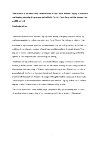 'The manner of life of Anselm, a man beloved of God': Saint Anselm’s legacy in historical and hagiographical writing connected to Christ Church, Canterbury and the abbey of Bec c.1080- c.1140