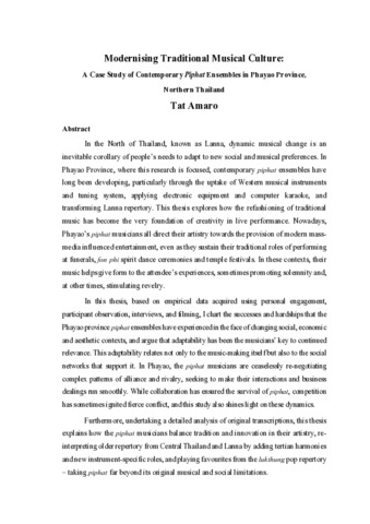 subject - My thesis aims to discuss the recent musical development of the contemporary piphat ensemble in Phayao Province, Northern Thailand in associate with how local patrons and musicians becoming reoriented towards embracing globalised cultural settings.