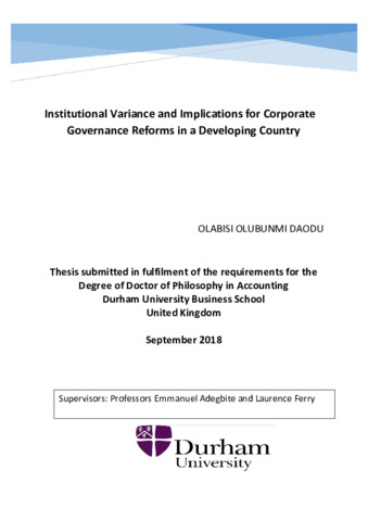 Corporate governance has attracted significant interest in the post-Enron era, following incidences of corporate fraud and collapses. Some of this attention has been witnessed in the proliferation of corporate governance codes of best practices and reforms. Following the agency theorisation, corporate governance codes and reforms are generically inclined. However, institutional configurations differ across contexts. (Neo-)Institutional theory posits that institutions influence corporate governance. Corporate governance practices, in turn, affect their institutional structures. Equally, organisational and social actors moderate and are compelled by these institutional boundaries. Drawing on these perspectives, this study investigates the inference of the distinct institutional context of developing countries, for corporate governance reforms. It expounds the implications of these evolving structures for the dynamism and procedures involved in such transformational schemes, in a bid to contribute to the theorisation of institutional reproduction. In this respect, a constructivist position is adopted by exploring the views of key stakeholders in the Nigerian corporate context. Against this backdrop, the study employs a qualitative method approach, involving in-depth interviews supported by documentary evidence, to fulfil its aim. In line with the description of salient stakeholders in corporate governance reforms, such key stakeholders include: regulators and policy makers, listed companies and other notable players, within the corporate governance context of Nigeria – a central economy in Africa. The findings are several. First, the study highlights that corporate governance reforms are motivated by the interface and alignment of established institutional logics, informed largely by the prevalent influence of a compendium of large family founders, regardless of supposed external pressures. Second, the expectations of the universally driven corporate governance reforms are found to contradict the dominant corporate governance performance in Nigeria, reflecting a complexity in application. Third, the mode and approach to corporate governance reforms in Nigeria are principally determined by internal legitimation, including: endogenous factors, social ratifications and path dependence, from established corporate governance structures. Lastly, corporate governance reforms are disclosed to be moderated primarily by informal mechanisms, as opposed to the more structured techniques of developed countries. Correspondingly, employment of such a framework of performance is advocated in the realisation of an institutionally informed corporate governance reform scheme in Nigeria, whereby the predominance of family block-holders could positively provide an avenue for tailored change through proper integration of their influence. In the main, the study forges a debate on the practice and policy that “a fit for all” corporate governance reform’s procedure is yet to be achieved. In this vein, theoretically, the study provides a model for understanding the institutionalisation of corporate governance reforms within maturing fields, as in Nigeria.