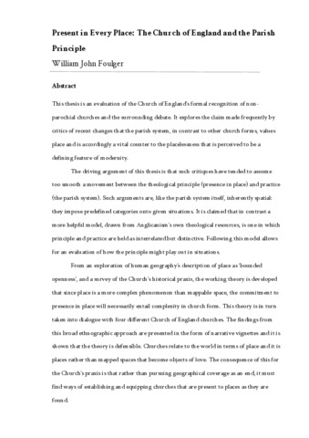 This thesis is an evaluation of the Church of England’s formal recognition of non-parochial churches and the surrounding debate. It explores the claim made frequently by critics of recent changes that the parish system, in contrast to other church forms, values place and is accordingly a vital counter to the placelessness that is perceived to be a defining feature of modernity. The driving argument of this thesis is that such critiques have tended to assume too smooth a movement between the theological principle (presence in place) and practice (the parish system). Such arguments are, like the parish system itself, inherently spatial: they impose predefined categories onto given situations. It is claimed that in contrast a more helpful model, drawn from Anglicanism’s own theological resources, is one in which principle and practice are held as interrelated but distinctive. Following this model allows for an evaluation of how the principle might play out in situations. From an exploration of human geography’s description of place as ‘bounded openness’, and a survey of the Church’s historical praxis, the working theory is developed that since place is a more complex phenomenon than mappable space, the commitment to presence in place will necessarily entail complexity in church form. This theory is in turn taken into dialogue with four different Church of England churches. The findings from this broad ethnographic approach are presented in the form of narrative vignettes and it is shown that the theory is defensible. Churches relate to the world in terms of place and it is places rather than mapped spaces that become objects of love. The consequence of this for the Church’s praxis is that rather than pursuing geographical coverage as an end, it must find ways of establishing and equipping churches that are present to places as they are found.