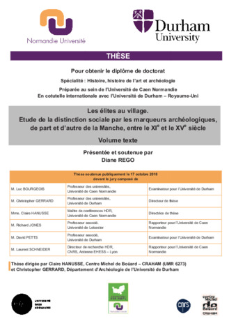 This PhD aims both at demonstrating that archaeological remains could and should be socially interpreted and at revising our - sometimes simplified - perspective on the socio-economic stratification of medieval villages. This project is based on the example of the excavations situated at Trainecourt (Grentheville - Calvados) where an “aristocratic” house had been established in the centre of the hamlet. Thus, a method has been developed to grasp village elites, of whom we know some details thanks to medieval written sources but who had hardly been studied in medieval archaeology. By using a comparative approach that draws a parallel between both French and English archaeological data and scientific perspectives; by adopting the theoretical frame offered by the Social Archaeology; by studying the social processes (the distinction, coming closer to, the performance) that are expressed by patterns of consumption in the settlement; by examining aristocratic sites (manor houses, moated sites, castles, etc.), we managed to establish a list of thirty-four archaeological indicators revealing an outstanding social identity. They are grouped in three categories: the use of space, the morphology of the settlement and a specific lifestyle. This repertoire was then compared to rural sites (villages, hamlets, etc.) situated on both sides of the Channel Sea, to emphasize some details of social stratification. As a whole, elite units have been spotted out in seven villages or hamlets and socio-economic hierarchies established for a dozen more.