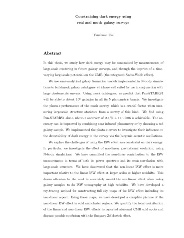 In this thesis, we study how dark energy may be constrained by measurements of large-scale clustering in future galaxy surveys, and through the imprint of a time-varying large-scale potential on the CMB (the integrated Sachs-Wolfe effect). We use semi-analytical galaxy formation models implemented in N-body simulations to build mock galaxy catalogues which are well suited for use in conjunction with large photometric surveys. Using mock catalogues, we predict that Pan-STARRS1 will be able to detect 10^8 galaxies in all its 5 photometric bands. We investigate the photo-z performance of the mock survey, which is a crucial factor when measuring large-scale structure statistics from a survey of this kind. We find using Pan-STARRS1 alone, photo-z accuracy of dz/(1+z) ~ 0.06 is achievable. The accuracy can be improved by combining near infrared photometry or by choosing a red galaxy sample. We implemented the photo-z errors to investigate their influence on the detectability of dark energy in the survey via the baryonic acoustic oscillations. We explore the challenges of using the ISW effect as a constraint on dark energy. In particular, we investigate the effect of non-linear gravitational evolution, using N-body simulations. We have quantified the non-linear contribution to the ISW measurements in terms of both its power spectrum and its cross-correlation with large-scale structure. We have discovered that the non-linear ISW effect is more important relative to the linear ISW effect at larger scales at higher redshifts. This draws attention to the need to accurately model the non-linear effect when using galaxy samples to do ISW tomography at high redshifts. We have developed a ray-tracing method for constructing full sky maps of the ISW effect including its non-linear aspect. Using these maps, we have developed a complete picture of the non-linear ISW effect in void and cluster regions. We quantify the total contribution of the linear and non-linear ISW effects to reported abnormal CMB cold spots and discuss possible confusion with the Sunyaev-Zel'dovich effect.