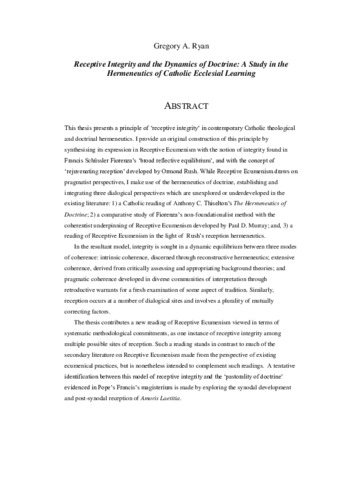 This thesis presents a principle of ‘receptive integrity’ in contemporary Catholic theological and doctrinal hermeneutics. I provide an original construction of this principle by synthesising its expression in Receptive Ecumenism with the notion of integrity found in Francis Schüssler Fiorenza’s ‘broad reflective equilibrium’, and with the concept of ‘rejuvenating reception’ developed by Ormond Rush. While Receptive Ecumenism draws on pragmatist perspectives, I make use of the hermeneutics of doctrine, establishing and integrating three dialogical perspectives which are unexplored or underdeveloped in the existing literature: 1) a Catholic reading of Anthony C. Thiselton’s The Hermeneutics of Doctrine; 2) a comparative study of Fiorenza’s non-foundationalist method with the coherentist underpinning of Receptive Ecumenism developed by Paul D. Murray; and, 3) a reading of Receptive Ecumenism in the light of Rush’s reception hermeneutics. In the resultant model, integrity is sought in a dynamic equilibrium between three modes of coherence: intrinsic coherence, discerned through reconstructive hermeneutics; extensive coherence, derived from critically assessing and appropriating background theories; and pragmatic coherence developed in diverse communities of interpretation through retroductive warrants for a fresh examination of some aspect of tradition. Similarly, reception occurs at a number of dialogical sites and involves a plurality of mutually correcting factors. The thesis contributes a new reading of Receptive Ecumenism viewed in terms of systematic methodological commitments, as one instance of receptive integrity among multiple possible sites of reception. Such a reading stands in contrast to much of the secondary literature on Receptive Ecumenism made from the perspective of existing ecumenical practices, but is nonetheless intended to complement such readings. A tentative identification between this model of receptive integrity and the ‘pastorality of doctrine’ evidenced in Pope’s Francis’s magisterium is made by exploring the synodal development and post-synodal reception of Amoris Laetitia.