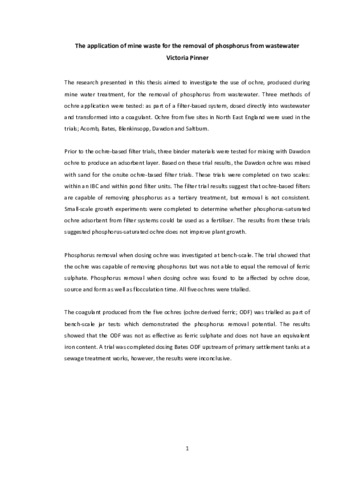 The research presented in this thesis aimed to investigate the use of ochre, produced during mine water treatment, for the removal of phosphorus from wastewater. Three methods of ochre application were tested: as part of a filter-based system, dosed directly into wastewater and transformed into a coagulant. Ochre from five sites in North East England were used in the trials; Acomb, Bates, Blenkinsopp, Dawdon and Saltburn. Prior to the ochre-based filter trials, three binder materials were tested for mixing with Dawdon ochre to produce an adsorbent layer. Based on these trial results, the Dawdon ochre was mixed with sand for the onsite ochre-based filter trials. These trials were completed on two scales: within an IBC and within pond filter units. The filter trial results suggest that ochre-based filters are capable of removing phosphorus as a tertiary treatment, but removal is not consistent. Small-scale growth experiments were completed to determine whether phosphorus-saturated ochre adsorbent from filter systems could be used as a fertiliser. The results from these trials suggested phosphorus-saturated ochre does not improve plant growth. Phosphorus removal when dosing ochre was investigated at bench-scale. The trial showed that the ochre was capable of removing phosphorus but was not able to equal the removal of ferric sulphate. Phosphorus removal when dosing ochre was found to be affected by ochre dose, source and form as well as flocculation time. All five ochres were trialled. The coagulant produced from the five ochres (ochre derived ferric; ODF) was trialled as part of bench-scale jar tests which demonstrated the phosphorus removal potential. The results showed that the ODF was not as effective as ferric sulphate and does not have an equivalent iron content. A trial was completed dosing Bates ODF upstream of primary settlement tanks at a sewage treatment works, however, the results were inconclusive.