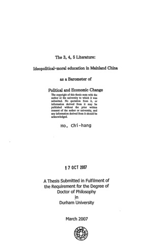 The 3, 4, 5 literature : ideopolitical-moral education in Mainland China as a barometer of political and economic change