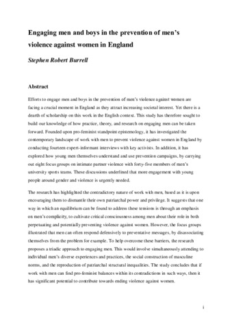 Efforts to engage men and boys in the prevention of men's violence against women are facing a crucial moment in England as they attract increasing societal interest. Yet there is a dearth of scholarship on this work in the English context. This study has therefore sought to build our knowledge of how practice, theory, and research on engaging men can be taken forward. Founded upon pro-feminist standpoint epistemology, it has investigated the contemporary landscape of work with men to prevent violence against women in England by conducting fourteen expert-informant interviews with key activists. In addition, it has explored how young men themselves understand and use prevention campaigns, by carrying out eight focus groups on intimate partner violence with forty-five members of men's university sports teams. These discussions underlined that more engagement with young people around gender and violence is urgently needed. The research has highlighted the contradictory nature of work with men, based as it is upon encouraging them to dismantle their own patriarchal power and privilege. It suggests that one way in which an equilibrium can be found to address these tensions is through an emphasis on men's complicity, to cultivate critical consciousness among men about their role in both perpetuating and potentially preventing violence against women. However, the focus groups illustrated that men can often respond defensively to preventative messages, by disassociating themselves from the problem for example. To help overcome these barriers, the research proposes a triadic approach to engaging men. This would involve simultaneously attending to individual men's diverse experiences and practices, the social construction of masculine norms, and the reproduction of patriarchal structural inequalities. The study concludes that if work with men can find pro-feminist balances within its contradictions in such ways, then it has significant potential to contribute towards ending violence against women.