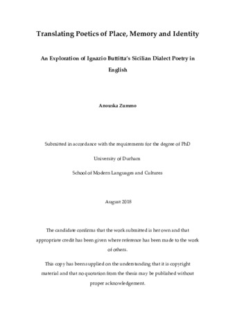 The thesis explores a selection of Ignazio Buttitta's Sicilian dialect poems in English translation, presenting the process of translation as a means of understanding the text as a linguistic (and therefore linguistically representative) message, a cultural embodiment (and spatially situated) embodiment of topoi, and an ideological (politically active) tool for the preservation of identity. Three folios of translations have as their focus these angles of investigation respectively, prefaced by an exploration of the polycentric Italian linguistic context and discussion of the terms 'language' and 'dialect'. The research addresses individual linguistic choice, initially through attempts to mirror the style and impact in English, moving on to address culturally representative translation practices and, finally, the subjective persona of the poet and translator within the translations. The poems traverse Buttitta's lifetime of writing, addressing the influence of a sense of fading or threatened identity, which impinged upon regional culture and local means of expression; I look at collective memory, preservation of memory and place through language as a form of repository, acknowledging the onus on translation into a lingua franca. This leads to an in-depth repositioning of the visibility of translational processes and decision-making, foregrouding the translator's textual encounters in order to maximize understanding of the workings of language in transfer. The underlying drive of the research is to uncover a poetics of place and memory of which dialect is singularly depictive and, in so doing, to examine multifaceted approaches that seek to transfer such linguistic, cultural and ideological significance in English translation.