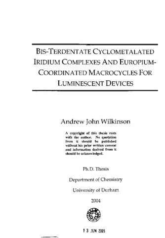 Bis-terdentate cyclometalated iridium complexes and europium-coordinated macrocycles for luminescent devices.
