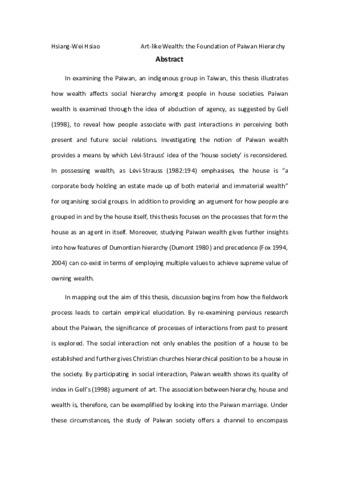 In examining the Paiwan, an indigenous group in Taiwan, this thesis illustrates how wealth affects social hierarchy amongst people in house societies. Paiwan wealth is examined through the idea of abduction of agency, as suggested by Gell (1998), to reveal how people associate with past interactions in perceiving both present and future social relations. Investigating the notion of Paiwan wealth provides a means by which Lévi-Strauss’ idea of the ‘house society’ is reconsidered. In possessing wealth, as Lévi-Strauss (1982:194) emphasises, the house is “a corporate body holding an estate made up of both material and immaterial wealth” for organising social groups. In addition to providing an argument for how people are grouped in and by the house itself, this thesis focuses on the processes that form the house as an agent in itself. Moreover, studying Paiwan wealth gives further insights into how features of Dumontian hierarchy (Dumont 1980) and precedence (Fox 1994, 2004) can co-exist in terms of employing multiple values to achieve supreme value of owning wealth. In mapping out the aim of this thesis, discussion begins from how the fieldwork process leads to certain empirical elucidation. By re-examining pervious research about the Paiwan, the significance of processes of interactions from past to present is explored. The social interaction not only enables the position of a house to be established and further gives Christian churches hierarchical position to be a house in the society. By participating in social interaction, Paiwan wealth shows its quality of index in Gell’s (1998) argument of art. The association between hierarchy, house and wealth is, therefore, can be exemplified by looking into the Paiwan marriage. Under these circumstances, the study of Paiwan society offers a channel to encompass different perspectives of anthropology to approach indigenous context.