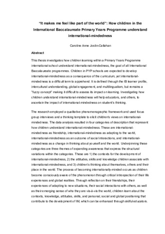 This thesis investigates how children learning within a Primary Years Programme international school understand international-mindedness, the goal of all International Baccalaureate programmes. Children in PYP schools are expected to develop international-mindedness as a consequence of the curriculum, yet international-mindedness is a difficult term to apprehend. It is defined through the IB learner profile, intercultural understanding, global engagement, and multilingualism, but remains a “fuzzy concept” making it difficult to assess its impact on learning. Investigating how children understand international-mindedness will help educators, and others, to ascertain the impact of international-mindedness on student’s thinking. The research employed a qualitative phenomenographic framework and used focus group interviews and a thinking template to elicit children's views on international-mindedness. The data analysis resulted in four categories of description that represent how children understand international-mindedness. These are international-mindedness as friendship, international-mindedness as adapting to the world, international-mindedness as an outcome of social interactions, and international-mindedness as a change in thinking about yourself and the world. Underpinning these categories are three themes of expanding awareness that express the structural variations within the categories. These are 1) the contexts for the development of international-mindedness, 2) the attitudes, skills and knowledge children associate with international-mindedness, and 3) children’s thinking about themselves, others and their place in the world. The process of becoming internationally-minded occurs as children become consciously aware of the phenomenon through critical introspection of their life experiences and global realities. Through reflection on their friendships, their experiences of adapting to new situations, their social interactions with others, as well as their emerging sense of who they are vis-à-vis the world, children learn about the contexts, knowledge, attitudes, skills, and personal, social and global positioning that contribute to the development of IM, which can be enhanced through skilful educators.
