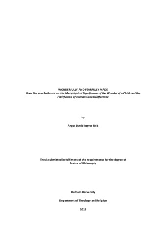 WONDERFULLY AND FEARFULLY MADE: Hans Urs von Balthasar on the Metaphysical Significance of the Wonder of a Child and the Fruitfulness of Human Sexual Difference