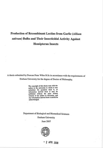Production of Recombinant Lectins from Garlic (Allium Sativum) Bulbs and Their Insecticidal Activity Against Hemipteran Insects.