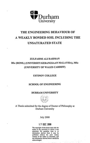 THE ENGINEERING BEHAVIOUR OF A WEAKLY BONDED SOIL INCLUDING THE UNSATURATED STATE.
