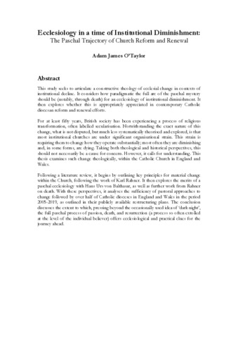 This study seeks to articulate a constructive theology of ecclesial change in contexts of institutional decline. It considers how paradigmatic the full arc of the paschal mystery should be (notably, through death) for an ecclesiology of institutional diminishment. It then explores whether this is appropriately appreciated in contemporary Catholic diocesan reform and renewal efforts. For at least fifty years, British society has been experiencing a process of religious transformation, often labelled secularisation. Notwithstanding the exact nature of this change, what is not disputed, but much less systematically theorised and explored, is that most institutional churches are under significant organisational strain. This strain is requiring them to change how they operate substantially; most often they are diminishing and, in some forms, are dying. Taking both theological and historical perspectives, this should not necessarily be a cause for concern. However, it calls for understanding. This thesis examines such change theologically, within the Catholic Church in England and Wales. Following a literature review, it begins by outlining key principles for material change within the Church, following the work of Karl Rahner. It then explores the merits of a paschal ecclesiology with Hans Urs von Balthasar, as well as further work from Rahner on death. With these perspectives, it analyses the sufficiency of pastoral approaches to change followed by over half of Catholic dioceses in England and Wales in the period 2005-2019, as outlined in their publicly available restructuring plans. The conclusion discusses the extent to which, pressing beyond the occasionally used idea of ‘dark night’, the full paschal process of passion, death, and resurrection (a process so often extolled at the level of the individual believer) offers ecclesiological and practical clues for the journey ahead.