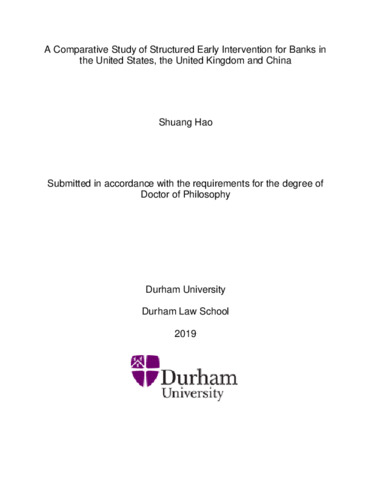 Banks have always been key players in the financial sector nationally and internationally. After the Global Financial Crisis 2007-2009 (GFC), many countries have gone through reforms of banking regulatory frameworks, especially focusing on mechanisms of early identification and management of banks in distress at early stages (structured early intervention for banks). These mechanisms aim to equip banking regulators with chances and resources to take corrective measures to troubled banks before their financial conditions continue to deteriorate. The United States adopted such a mechanism, Prompt Corrective Actions (PCA), during the Savings and Loans Crisis in the 1990s. The United Kingdom has reformed its bank regulatory framework and adopted a similar mechanism, Proactive Intervention Framework (PIF), to manage distressed banks before risks have been materialised, after the GFC. China has been in the process of designing and reforming a particular mechanism for early intervention of troubled banks. However, existing literature rarely provides detailed and comprehensive breakdowns and analyses of structured early intervention for banks as to what components should be considered as essential and what types of components are effective in the context of early intervention for banks. For China, establishing a tailored mechanism of structured early intervention for banks is necessary, since the stability of the Chinese banking sector, with a great number of banks with global significance, is not only important for China but also for the stability of the international banking sector. Therefore, this thesis provides a detailed breakdown of important components of structured early intervention for banks, namely triggering events and corrective actions, on the basis of current US, UK and Chinese practice, from a comparative law perspective. In particular, this thesis analyses what types of components of structured early intervention for banks are effective and suitable for the Chinese banking regulatory framework and proposes a specific mechanism for Chinese structured early intervention for banks.