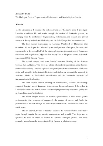 In this dissertation, I examine the self-construction of Jean Lorrain’s myth. I investigate Lorrain’s scandalous life and works through the notion of ‘harlequin poetics’, as emerging from the aesthetics of fragmentation, performance, and scandal, at a pivotal moment in literary and cultural Modernity, and the Belle Époque in a broader context. The first chapter concentrates on Lorrain’s ‘Patchwork of Narratives’ that constitutes his poetic practice. Informed by the amalgamation of the press, literature, and photography in the second half of the nineteenth century, the erratic use of fragments, discourses and snapshots of high and low society life in his prose creates a dynamic panorama of Belle Époque France. The second chapter deals with Lorrain’s constant blurring of the frontiers between fact and fiction. This provokes a form of metaleptic mystification that has two distinct effects: firstly, Lorrain’s exploded ethos participates in the construction of his own myth, and secondly, it also impacts his text, which, in leaving apparent the seams of its structure, alludes to fin-de-siècle mystification and the Modernist aesthetics of fragmentation/self-reflexivity. The third chapter, entitled ‘Montage of Temporalities’, examines the montage aspect of Lorrain’s use of legendary, historical, and literary references. I show that, in Lorrain’s literature, the body is in turn de-formed (fragmentation), un-formed (void), and re-formed (montage/multiplicity). The fourth chapter focuses on Lorrain’s performance at three levels: gender performativity (the invention of queerness), the poetics of excess, and finally the performance of the self through the visual representations of Lorrain in and out of the media space. The last chapter, ‘Poetics of Scandal’, examines the self-construction of Lorrain’s myth through (media, literary, moral) transgressions and scandal. This helps me to question the issue of ethics in relation to Lorrain’s ‘harlequin poetics’ and, more generally, scandal as media strategy in the Belle Époque in relation to today.