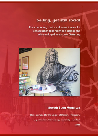 This thesis, conducted as part of a project which aims to investigate sociality and rhetoric culture theory, does so by considering the rhetorics of personhood among the self-employed in Halle an der Saale, eastern Germany, based on extensive ethnographic fieldwork among businesspersons, advisors and officials. Sociality and rhetoric culture theory suggests that it is the persuasive action of humans which effects the continuous and inventive cultural change which our evolved interactive and intersubjective abilities permits. In a region which has seen particularly intense and often negative social, political and economic change towards late capitalism as it moved from a state socialism – where the egalitarian ‘socialist personality’ was fostered alongside a vehement criticism of capitalist individualism – I investigate the rhetorical strategies the self-employed use to describe themselves, their lives and businesses as they take up this most ‘individualistic’ practice as well as those employed by government and parts of the media who encourage it. Based on participant observation, interview data and media analyses, I argue that despite tacit approval of capitalism by the self-employed, the necessity to engage in it brought about by current circumstances is rhetorically tempered by the evocation of the increased sense of solidarity and consociality eastern Germans have been long noted to claim they possess in comparison to their western co-citizens. I also suggest that highlighting these aspects, and indeed being so, offers a distinct advantage to eastern businesspersons in an increasingly competitive and precarious world of encroaching neoliberal work practices. After a thorough introduction to sociality and rhetorical culture theory, and a consideration of research methods and ethical and reflective issues, in Chapter 3 I introduce my fieldsite and its particular context. I show how aspects of GDR rhetoric regarding work and society still abound in Halle, both in the built landscape and in publications. Chapter 4 features a media analysis of how Germans are encouraged to change to become ‘mini-corporations’ and in it, and in Chapter 5, through participation at courses, and interviews, how acceptance of this is tempered by eastern German focus on consociality, and on the importance of the person. In Chapter 6, based on participation in product promotion I show how success follows focussing on these aspects by these precarious ‘new self-employed’. In Chapter 7, I detail how through the use of promotional ‘mass-gifts’, they create sociality by evoking GDR-era social networks of sharing and consumption. Before a final conclusion, Chapter 8 shows how Halle itself uses people to market itself. I demonstrate how the city authorities, as well as the self-employed, use ‘famous son’ G. F. Handel, but also the self-employed themselves, in order to combat Halle’s negative personification as the post-industrial, socio-economically deprived ‘Grey Diva’.