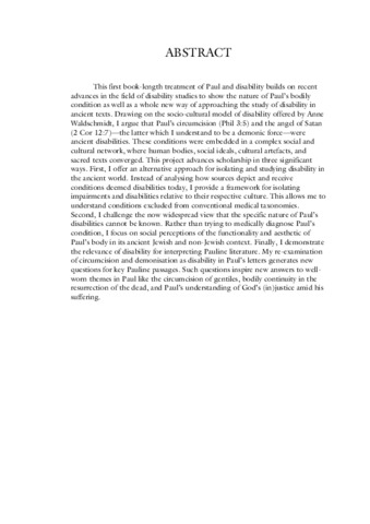 This first book-length treatment of Paul and disability builds on recent advances in the field of disability studies to show the nature of Paul’s bodily condition as well as a whole new way of approaching the study of disability in ancient texts. Drawing on the socio-cultural model of disability offered by Anne Waldschmidt, I argue that Paul’s circumcision (Phil 3:5) and the angel of Satan (2 Cor 12:7)––the latter which I understand to be a demonic force––were ancient disabilities. These conditions were embedded in a complex social and cultural network, where human bodies, social ideals, cultural artefacts, and sacred texts converged. This project advances scholarship in three significant ways. First, I offer an alternative approach for isolating and studying disability in the ancient world. Instead of analysing how sources depict and receive conditions deemed disabilities today, I provide a framework for isolating impairments and disabilities relative to their respective culture. This allows me to understand conditions excluded from conventional medical taxonomies. Second, I challenge the now widespread view that the specific nature of Paul’s disabilities cannot be known. Rather than trying to medically diagnose Paul’s condition, I focus on social perceptions of the functionality and aesthetic of Paul’s body in its ancient Jewish and non-Jewish context. Finally, I demonstrate the relevance of disability for interpreting Pauline literature. My re-examination of circumcision and demonisation as disability in Paul’s letters generates new questions for key Pauline passages. Such questions inspire new answers to well-worn themes in Paul like the circumcision of gentiles, bodily continuity in the resurrection of the dead, and Paul’s understanding of God’s (in)justice amid his suffering.