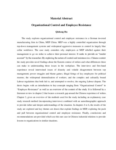 Material Abstract Organizational Control and Employee Resistance Qizhong Hu The study explores organizational control and employee resistance in a German invested manufacturing firm in China, MEP China. MEP was a highly controlled organization through top-down management systems and widespread aggressive measures to control its largely blue collar workforce. The case study considers why employees at MEP rebelled against their management to go on strike to achieve their personal interest. It seeks to provide an “insider account” by the researcher. By exploring the nature of control and resistance in a Chinese context the study provides novel findings about the Eastern context of strikes and what differences these can make to understanding these issues in the workplace. The interviews and first-hand experience reveal intertwined issues of disunity and volatile disagreement between top management; power struggles and blame games; illegal firings of key employees for political reasons; the widespread demoralisation of workers; and the complex and culturally bound Labour regulations that both led to, and attempted to resolve, the ongoing Labour dispute. The thesis begins with an introduction to key concepts ranging from “Organizational Control” to “Employee Resistance” as well as an overview of the context of the study. It is followed by a literature review in chapter 2 that locates a research gap around the Chinese experience of strikes. Chapter 3, gives an overview of the methods used for the study including an explanatory case study research method (incorporating interviews) combined with an autoethnographic approach to provide richer and deeper understandings of the situation. In chapters 4 to 6, the results of the study are explored and key themes are drawn that explain findings in MEP, exploring the push and pull between organizational control and employee resistance. Finally, conclusions and recommendations are provided which use this rare case in Chinese industrial relations to provide lessons to organizations in similar situations.