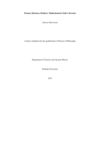 My thesis navigates the maternal experience in the Heroides, thereby resituating them within the most recent gender-based readings of Ovidian works, and Latin literature as a whole, as well as addressing works that deal with motherhood in the Roman world. Ovid’s elegiac epistles, which – almost uniquely in classical literature – give a subjective voice to female characters, offer a fertile ground of enquiry to broaden the scholarly debate on motherhood in Latin Literature, as well as contributing to discussions on gender-informed interpretations of Ovidian poetry. By building on a combination of a philological approach and gender theory, my thesis uncovers the subversive content of the Heroides, as well as leading us to appreciate their stylistic, thematic, and narratological peculiarities, including: a high degree of ambiguity; ironic discourse; interplay with previous sources; references to their contemporary context; polyphony; and the coexistence of literary genres. Chapter 1 (Her. 1) navigates Penelope’s relationship with Telemachus to show how motherhood serves the heroine’s appropriation of a central role within her household. Chapter 2 shows Phaedra’s self-empowerment in Her. 4, as well as Canace’s (re)appropriation of her maternal experience (Her. 11). Chapter 3 mainly draws from Butler’s gender performativity to explore Deianira (Her. 9), but also from Braidotti’s posthuman feminism to analyse Medea’s motherhood (Her. 12), which contributes to her self-construction as a female (posthuman) subject-in-becoming. Chapter 4 focuses on Hypsipyle’s and Dido’s letters (Her. 6 and 7) through the lens of Ettinger’s recent theorisations on the maternal body and narrative theory, respectively. My thesis demonstrates that the heroines’ motherhood enhances their self-empowerment and catalyses the gender-role reversals that feature in their epistles. By showing how these mothers express their independence, in ways that are perhaps subtle, ironic, and highly rhetorical, my thesis also engages with contemporary discussions about women’s leadership, maternity, and gender equality.