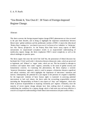 This thesis assesses the foreign-imposed regime change (FIRC) phenomenon as it has occurred in the past three decades, and in doing so highlights the important contradictions between liberal states’ global ambitions and the problematic realities of FIRC. It rejects the often-heard ‘Pottery Barn’ analogy (i.e. ‘you break it you own it’) in favour of an ‘orthodox’ or ‘Walzerian’ Just War Theory perspective. As the Pottery Barn Rule leaves many aspects of FIRC unexamined, its unquestioned acceptance results in an impoverished understanding of modern-day regime change, the thesis emphasises FIRC’s moral omplexity as well as the ethical challenges its practice poses. The thesis argues that since the end of the Cold War, the prominence of liberal discourse has facilitated the US-led world order’s distinction between democratic states, which are perceived as legitimate, and ‘illiberal’ or ‘rogue’ states, which are not. This has resulted in attempts to overthrow and replace these states’ regimes, ostensibly in the name of global security and humanitarian concerns. In examining this phenomenon, the thesis employs a casuistic ‘historical illustrations’ approach, which is used to propose a distinction between superficial and radical variations, and which highlights the importance of interveners’ intentions and motives. Subsequently, the potential for a just regime in the presence of a regime’s culpability for the large-scale violation of basic human rights is examined. In assessing potential interventions to halt such abuses, the thesis splits the overarching responsibility concept (including the ‘Responsibility to Protect’) into aspects of ‘duty’ and ‘obligation’, which also relate to postwar responsibilities in imposing ‘minimally just’ regimes. Ultimately, since the majority of recent regime change attempts have been nothing short of cautionary tales,establishing the conditions for a regime change which is both more just and more effective is crucial to an improved understanding of both liberal interventionism and post-conflict ethics.