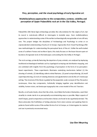 Palaeolithic (Old Stone Age) archaeology provides the only evidence for the origins of art, but its record is notoriously difficult to interrogate in testable ways. Even multidisciplinary approaches to understanding some of the earliest archaeologically recognisable art are still very rare. This project bridges the disciplines of Archaeology and Psychology to arrive at an unprecedented understanding of early art in Europe. Approaches from Visual Psychology offer new methodologies for understanding the perceptual basis of the art. Unlike the well-studied caves of southern France and northern Spain, this study focuses on the lesser-known open-air locations of engraved rocks in the landscapes surrounding the Côa Valley in Portugal. The rock carvings, primarily featuring the depiction of prey animals, are analysed by deploying traditional archaeological methods such as typological surveying and distribution mapping, and are combined with insights from the psychology of perception in the form of six perception-based experiments. These experiments illuminate underlying mechanisms behind (1) the drawing of animals; (2) identifying salient animal features; (3) panel compositioning; (4) motif superimpositioning; (5) rock art viewing distances and pigmentation and (6) the art’s landscape setting. The structure of this thesis is guided by the sequential, scalar concept of Prey Perception Landscapes, three key components, holistically bringing together prey identification and visibility, human vision, and landscape topography into a new model of the arts’ function. Results, on all scalar levels, show that the artists, most likely the hunters themselves, used their visuality to create marks in as perceptually accommodating ways as possible. Major aspects of motif shapes, panel compositions and location choices are found to be cognitively-derived. This thesis advocates the fruitfulness of taking advances from vision science and applying them to patterns found within some of the earliest forms of art in Europe, as it interrogates its creation and use in previously unconceived ways.