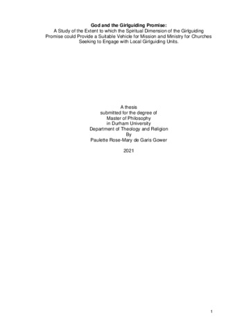 God and the Girlguiding Promise: A Study of the Extent to which the Spiritual Dimension of the Girlguiding Promise could Provide a Suitable Vehicle for Mission and Ministry for Churches Seeking to Engage with Local Girlguiding Units.