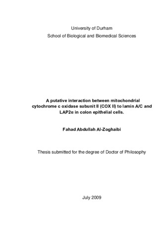 The lamina is a cage-like structure, composed of lamins, found underneath the inner nuclear membrane (INM). In mammals, Lamins are type V intermediate filaments. Three genes encode seven different lamin proteins. These genes are LMNA, LMNB1 and LMNB2. Lamins are classified into A- and B-types. A-type lamins, Lamin A, Lamin C, Lamin Aδ10 and Lamin C2, are mainly expressed in differentiated tissues. All encodes by the LMNA gene and products of alternative splicing. Recent studies have shown the expression of Lamin A/C in colon crypt epithelia cells. This expression was greater in differentiated epithelial and stem cells than in the proliferation zone. Since 1999, mutations in LMNA have been shown to cause several different inherited diseases in muscle, fat, bone, skin and nerve tissues. LAP2α is one of the strong binding partners to Lamin A/C. LAP2α has a specific function as a non-membrane protein associated with the nucleoskeleton and may help to organize higher order chromatin structure by interacting with Lamin A/C. To understand more about Lamin A/C and LAP2α in colon epithelial development,a Yeast 2-hybrid screen was used to look for novel protein interactions to Lamin A/C and/or LAP2a. It was found Cytochrome c oxidase subunit II (Cox2) is a putative binding partner to Lamin A/C and LAP2 α. Cox2 is encoded by the mitochondrial genome and imported into complex IV (COX) of the mitochondrial respiratory chain (MRC). The majority of mitochondrial proteins are encoded by nuclear DNA. However, 13 essential subunits of the MRC are encoded by mtDNA. The MRC is composed of five multi-subunit complexes (I-V). MRC is implicated in ATP generation and is involved in apoptosis in response to different stimuli. Deficiency in COX in colon cancer cells results in resistance to apoptosis and increases in reactive oxygen species (ROS). Biochemical assays like Coimmunopreciptation (IP) and western blot (WB) and Immuno-gold labeling (TEM) were used. IP confirmed the putative interaction of Cox2 to Lamin A/C and LAP2α. WB showed the expression of lamin A/C and LAP2α in the mitochondrial and nuclear fractions but not in cytosol. TEM is alternative method showed the distribution of lamin A/C and LAP2α in the nucleus and mitochondria.