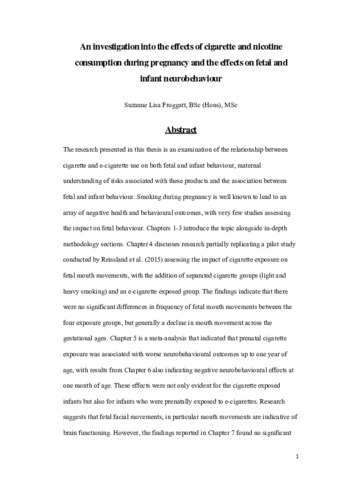 The research presented in this thesis is an examination of the relationship between cigarette and e-cigarette use on both fetal and infant behaviour, maternal understanding of risks associated with these products and the association between fetal and infant behaviour. Smoking during pregnancy is well known to lead to an array of negative health and behavioural outcomes, with very few studies assessing the impact on fetal behaviour. Chapters 1-3 introduce the topic alongside in-depth methodology sections. Chapter 4 discusses research partially replicating a pilot study conducted by Reissland et al. (2015) assessing the impact of cigarette exposure on fetal mouth movements, with the addition of separated cigarette groups (light and heavy smoking) and an e-cigarette exposed group. The findings indicate that there were no significant differences in frequency of fetal mouth movements between the four exposure groups, but generally a decline in mouth movement across the gestational ages. Chapter 5 is a meta-analysis that indicated that prenatal cigarette exposure was associated with worse neurobehavioural outcomes up to one year of age, with results from Chapter 6 also indicating negative neurobehavioural effects at one month of age. These effects were not only evident for the cigarette exposed infants but also for infants who were prenatally exposed to e-cigarettes. Research suggests that fetal facial movements, in particular mouth movements are indicative of brain functioning. However, the findings reported in Chapter 7 found no significant relation between fetal mouth movements and infant neurobehaviour. Chapter 8 provides an account of maternal perceptions of risks associated with both cigarette and e-cigarette use during pregnancy. Results indicate that women provide several justifications for continued smoking and that e-cigarettes were regarded as a riskier option. The thesis concludes with a general discussion of the main findings, implications for policy and a critique of the research.