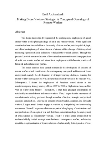 This thesis studies the development of the contemporary employment of armed drones within a conceptual genealogy of aerial and remote warfare. While significant attention has been devoted either to the novelty of drone warfare, or to its political, legal, and ethical underpinnings, I situate the use of drones within a lineage of thinking about the strategic purpose of aerial and remote violence in the twentieth century. Through this process, I provide a nuanced account of how armed drones continue and change practices of aerial and remote warfare and situate their employment within broader practices of historical and contemporary warfare. This thesis analyses three central moments in the development of concepts of remote warfare which contribute to the contemporary conceptual architecture of drone employment, namely the development of strategic bombing doctrines, planning for nuclear warfare during the Cold War, and practices of aerial warfare in the Vietnam War. Subsequently, I situate the employment of American armed drones in the counterinsurgency strategy employed from 2007 to 2011 in Afghanistan, Iraq, and the War on Terror more broadly. Throughout, I offer three principal contributions to scholarship on armed drones and remote warfare. First, I argue that the remoteness of armed drones is actively produced through a number of tactical, strategic, and political decisions and practices. Drawing on concepts of risk-transfer, vicarious, and surrogate warfare, I argue armed drones engage in warfare by manipulating and constructing remoteness. Second, I argue armed drones are part of a long legacy of contestations and marginalisations of concepts of war and that these contestations shape the employment of armed drones in contemporary warfare. Finally, I argue armed drones must be evaluated chiefly in their strategic contribution to contemporary warfare, and thereby reject the exceptionalisation of drone warfare as a fundamentally distinct practice of war.