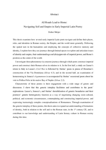 This thesis examines how several early imperial Latin poets navigate and define their places, roles, and identities in Roman society, the Empire, and the world more generally. Following the spatial turn in the humanities and employing the concepts of collective memory and identity, I explore how they use journeys through liminal spaces to explore and articulate issues of identity and empire, their understandings and (dis)approvals of imperial power, and Rome’s position as the centre of the world. I investigate these phenomena via concrete journeys through which poets construct imperial power and construct their Roman selves in relation to it. In the first half, a study on Caesar’s return to Italy in Lucan’s Civil War is followed by Statius’ poem in praise of Domitian’s construction of the Via Domitiana (Silvae 4.3); and in the second half, an examination of homecoming in Seneca’s Agamemnon is accompanied by Statius’ occasional poem about his visit to Pollius Felix in his native Bay of Naples (Silvae 2.2). Characteristic of these poems is their engagement with a wide range of genres and discourses. I show that this generic interplay facilitates and contributes to the poets’ explorations: Lucan’s, Seneca’s, and Statius’ destabilisation of generic boundaries and their journeys’ generic heterogeneity function as a way of negotiating changing socio-cultural, political, and economic circumstances, contemplating and constructing imperial power, and expressing increasingly complex conceptualisations of Romanness. Through examination of the generic interplay of these poems, this thesis aims to expand our understanding of formations of identity, both in relation to the self and to the Roman state, in the 1st century CE, and to contribute to our knowledge and understanding of Latin literary culture in Roman society during this time.